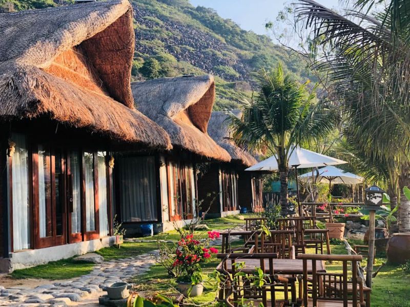 • Tiện nghi đầy đủ: Mỗi villa được trang bị đầy đủ tiện nghi như giường ngủ thoải mái, nhà vệ sinh riêng, quạt gió và cửa sổ rộng mở ra biển.