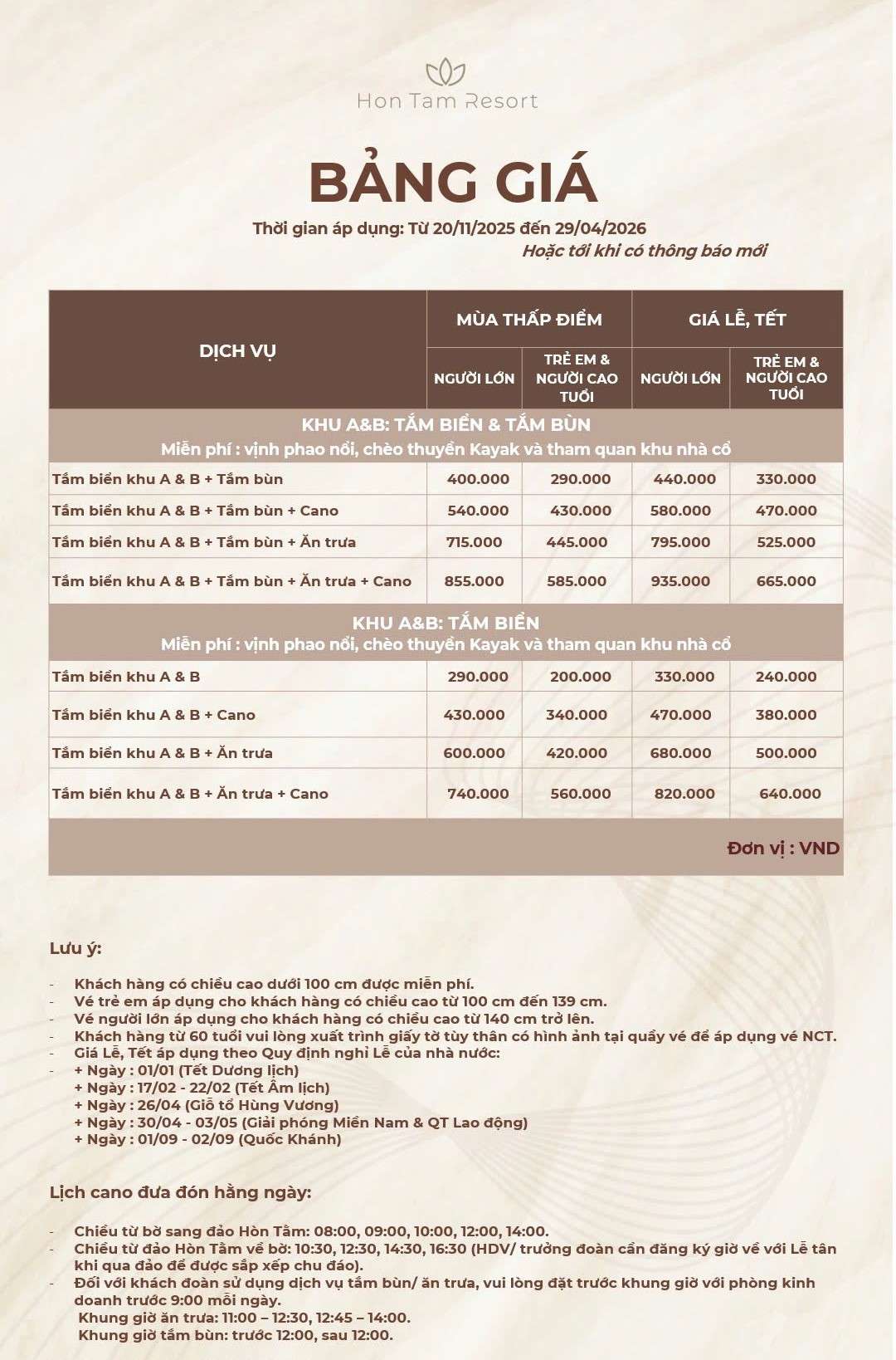 | Có tắm biển | ✅ Có | ❌ Không |