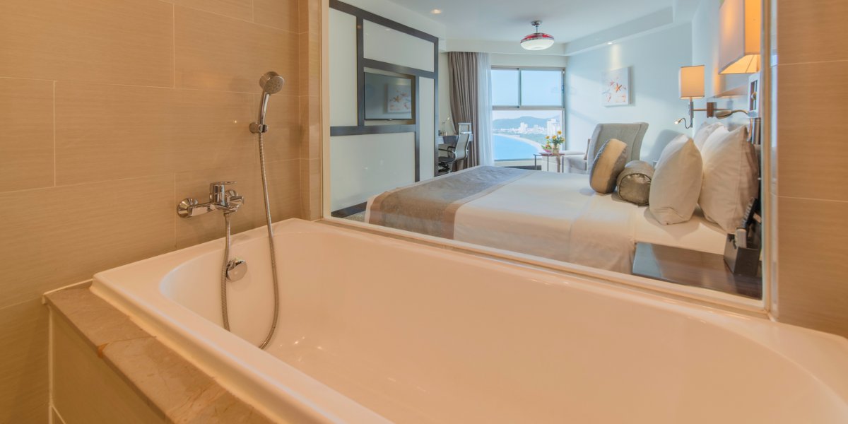 Tiện nghi nổi bật: phòng thiết kế sang trọng – hiện đại, tầm nhìn thoáng rộng ra biển; bàn làm việc, sofa, minibar, két sắt, TV, Wi-Fi; phòng tắm (vòi sen/bồn tắm theo cấu hình phòng).