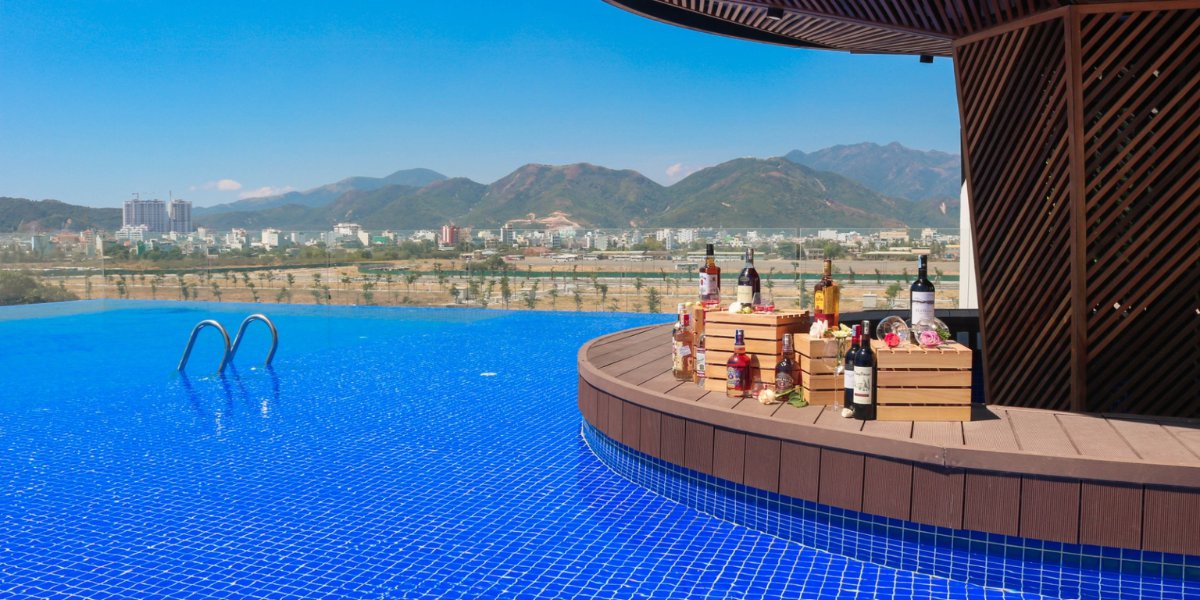 Hồ bơi tầng 6: thiết kế xanh ngọc lam, view biển và thành phố, phục vụ cocktail & nước ép tươi.